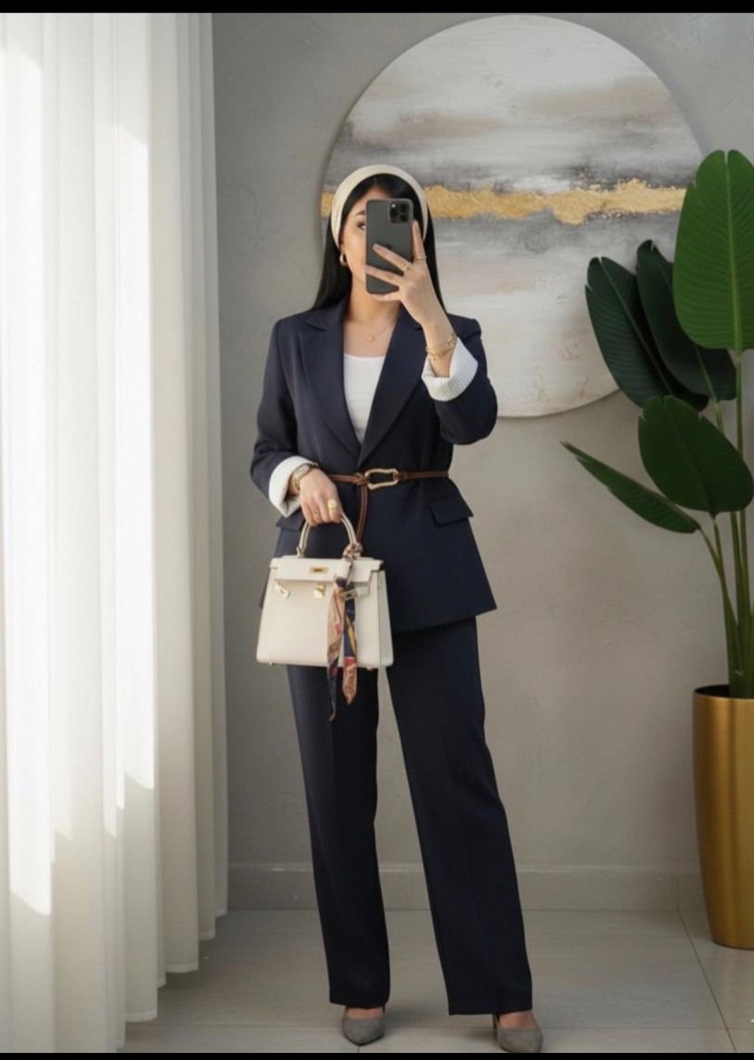 کت شلوار مزونی رونیکا با کمربند جنس کرپ مازراتی اعلا تنخور بی نظیر سایز فری ۳۸ تا ۴۶