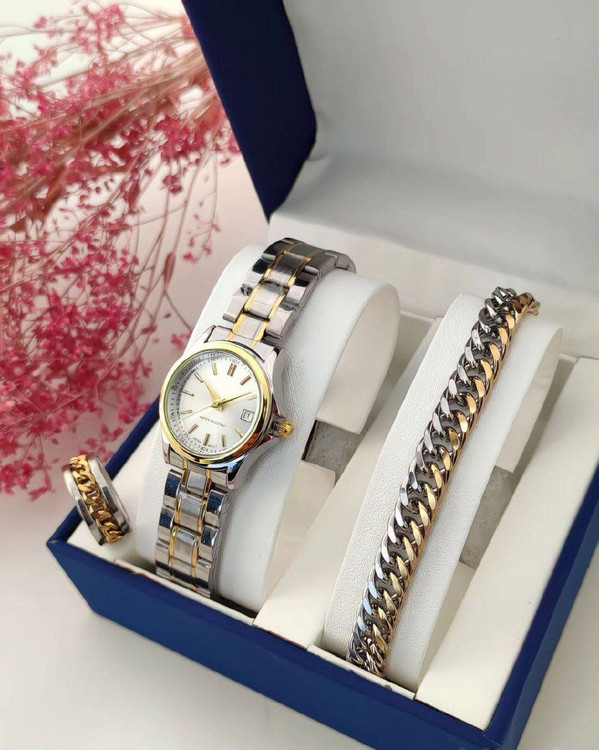 👚نام : پک زنانه یا مردانه ساعت کاسیو بنداستیل همراه با دستبند کارتیر دورنگ و حلقه زنانه یا مردانه