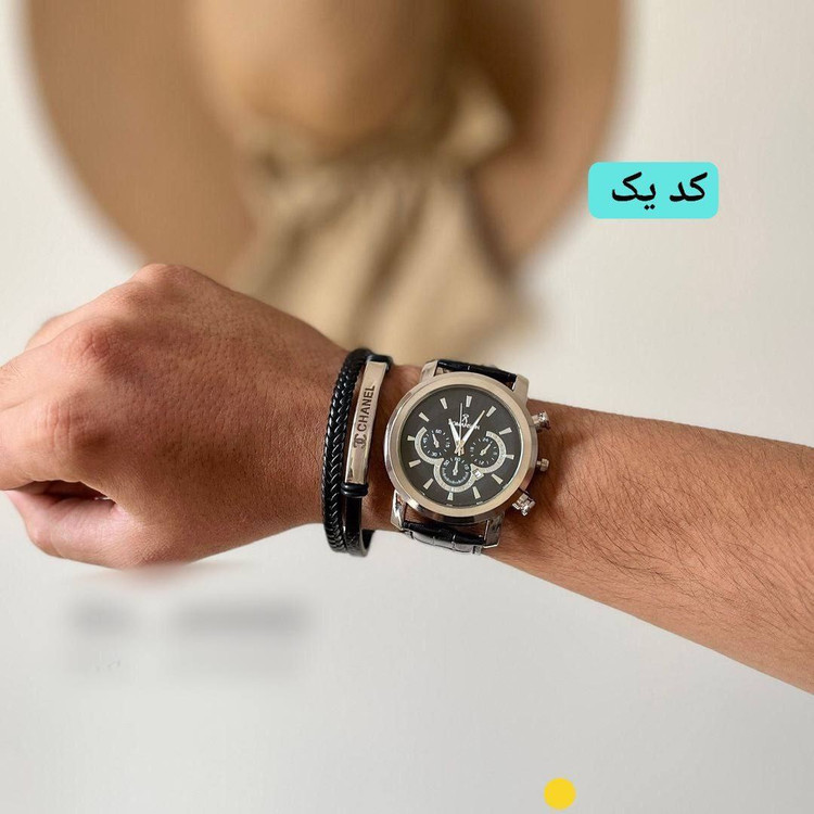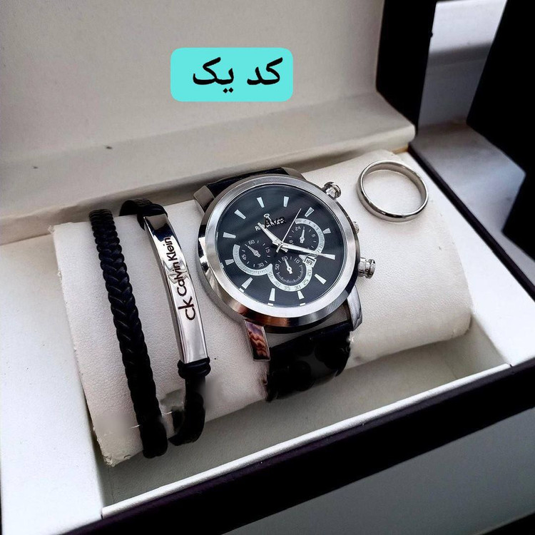 ساعت مردانه بندچرمی همراه با دستبند دو لاین چرم و حلقه