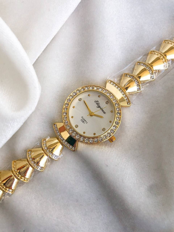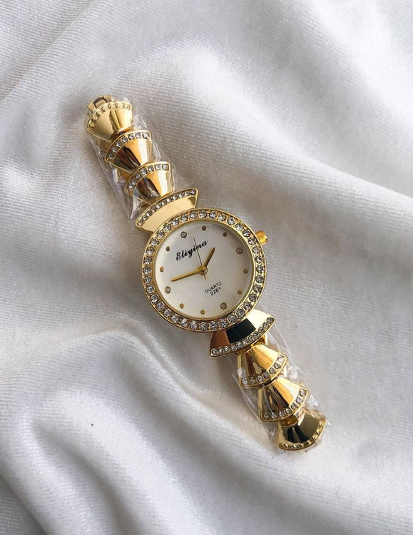 👚نام : ساعت زنانه یا دخترانه بند استیل طلایی صفحه گرد دور قاب نگین