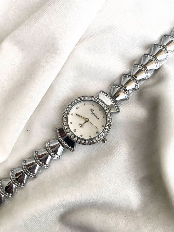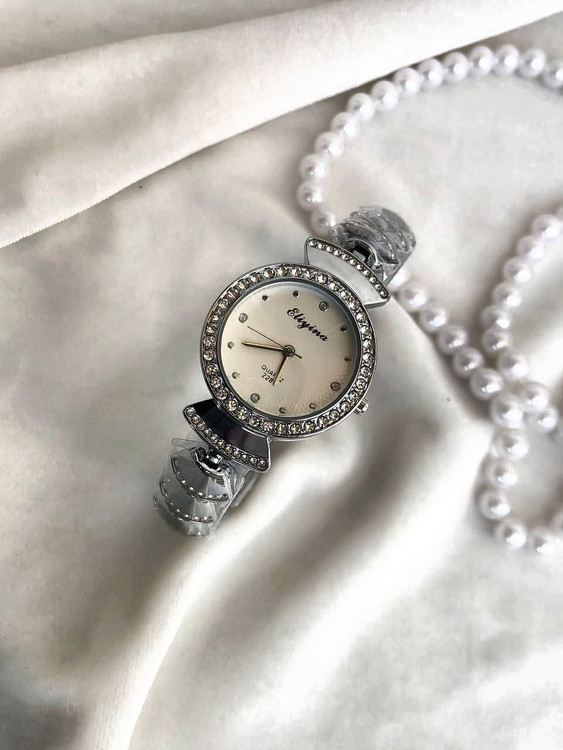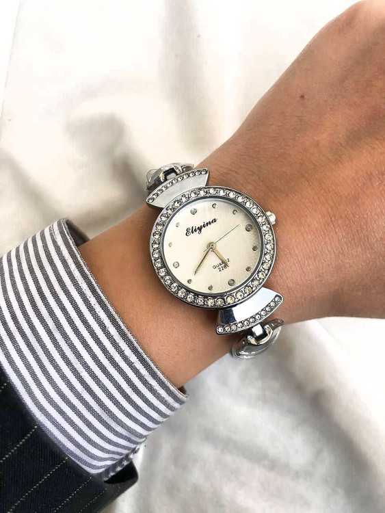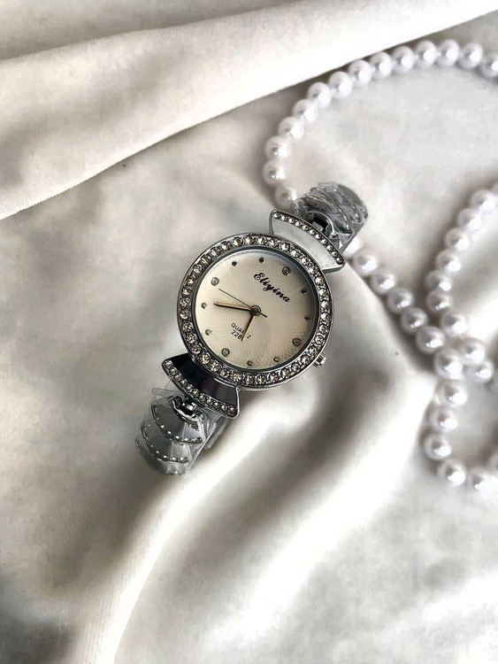 👚نام : ساعت زنانه یا دخترانه بند استیل نقره ای صفحه گرد دور قاب نگین