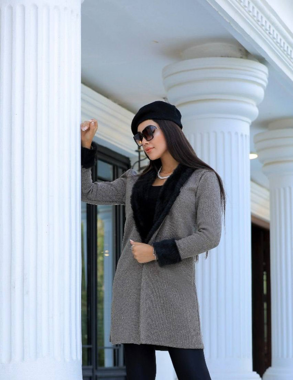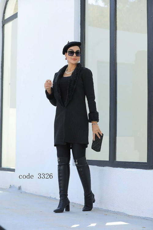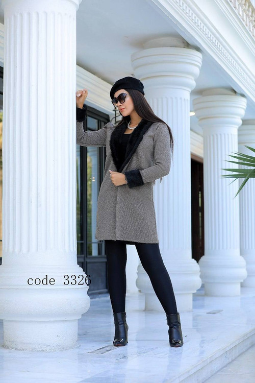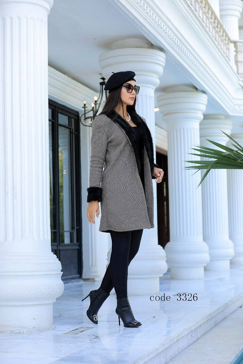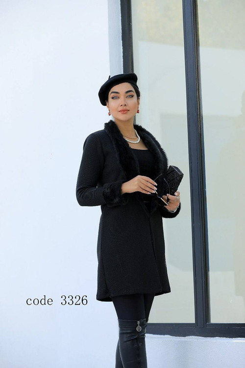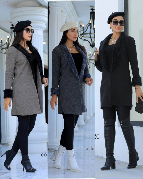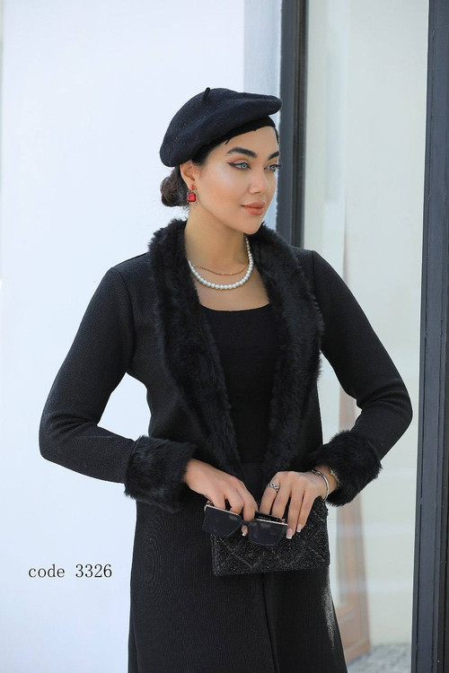 👗نخ اکرولیک کبریتی ضخیم اعلا بافته شده با ماشین الات آلمانی با تراکم سوزن بالا ریز بافت با وزن بالا همراه یقه کامل خز بلند وارداتی و کمر دار