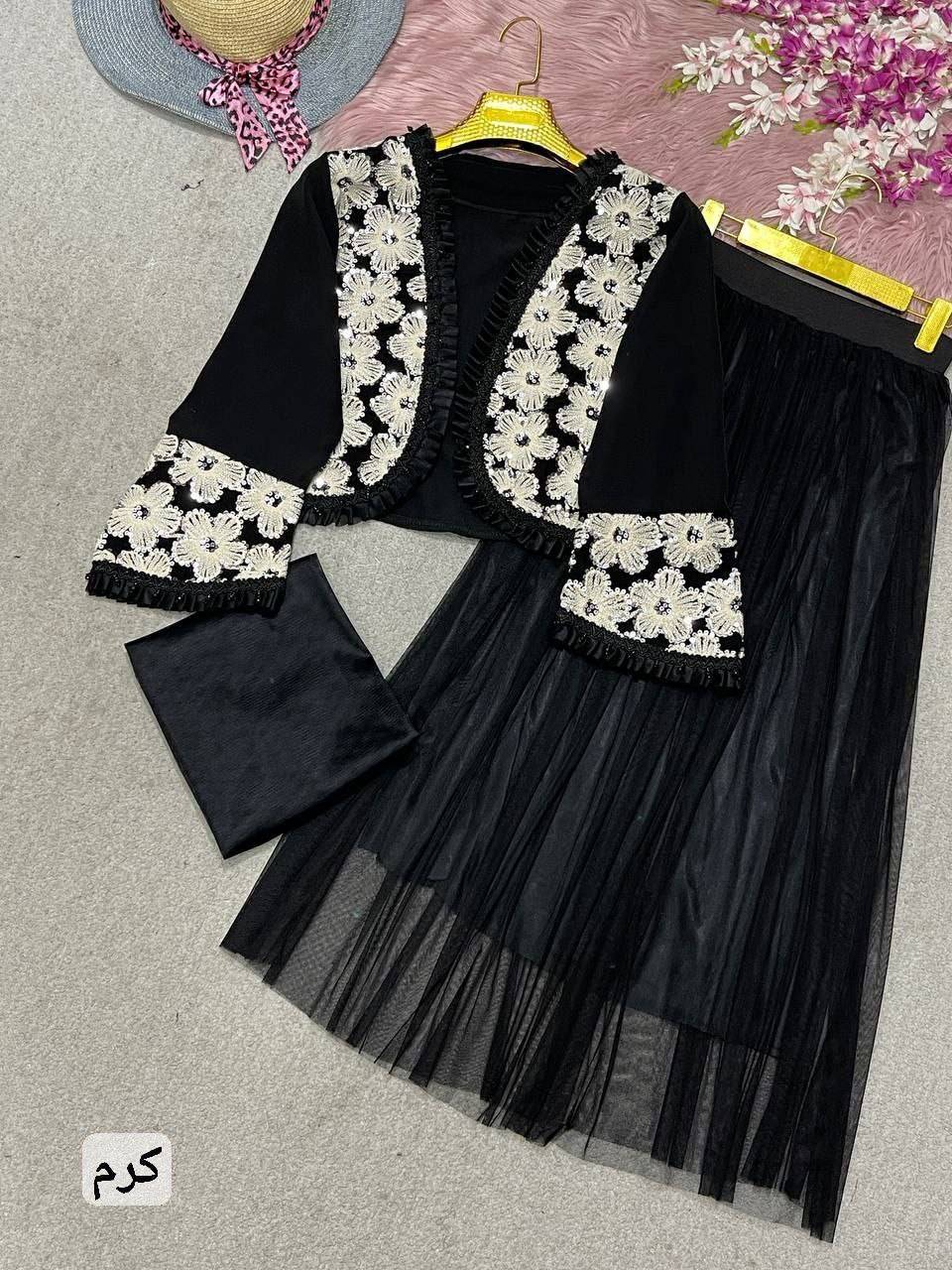 جنس : کت کرپ مازراتی با خرجکار گلدوزی شده دامن و شال تور