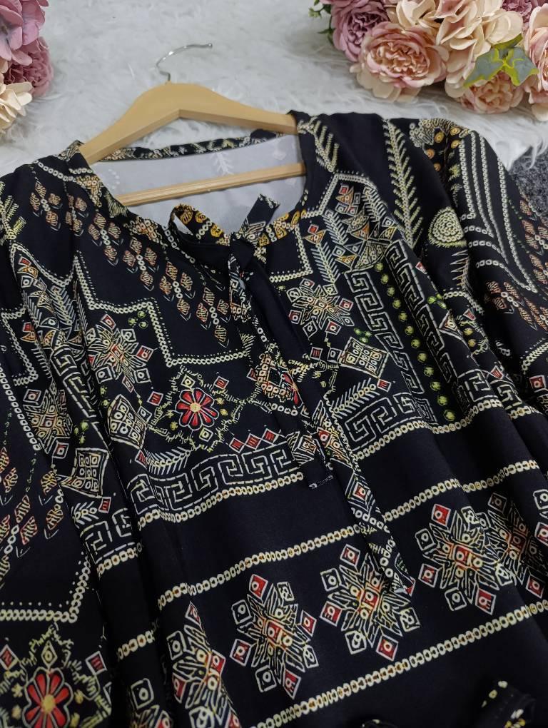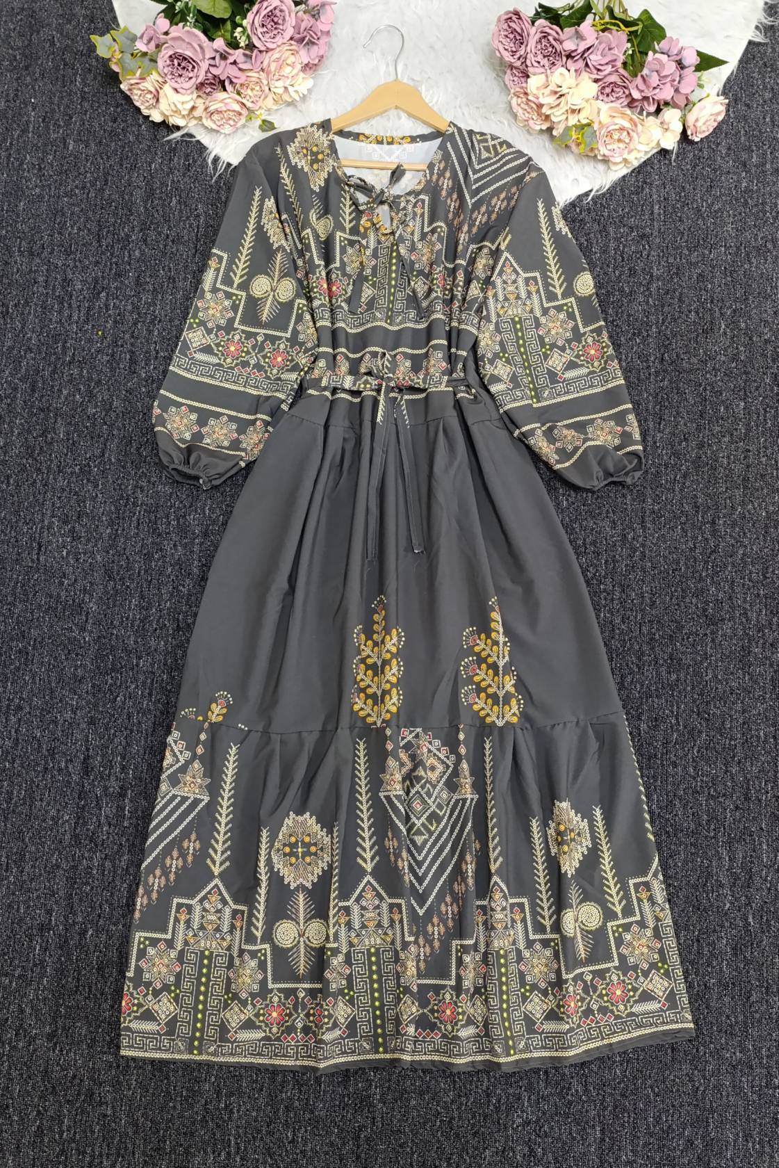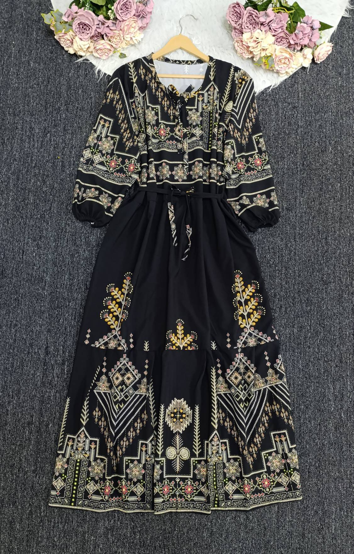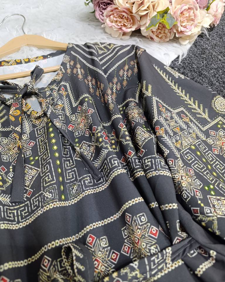 ✨ ترکیب جذاب کلاسیک و خاص برای خانمهایی که شیکپوشی براشون مهمه 💎 🌸 طراحی گلدار و کتیبه چشمنواز 🖤 رنگ های همیشه ترند 👗 مدل بلند و راحت، مناسب روزمره و مهمانی 🎀 کمر بنددار برای فرمدهی عالی به اندام ✨ جنس سبک و خنک، مناسب همه فصول