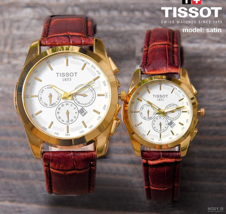 ست ساعت تیسوت بندقهوه ای صفحه سفید قاب طلایی