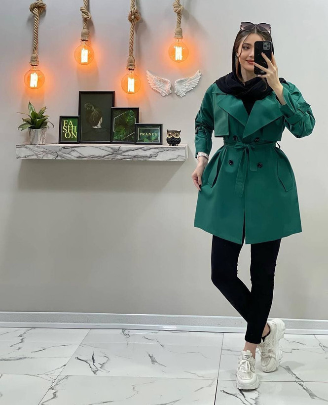 قد کار ۸۵ جلوی کار لایه پرشین دارد دوخت مزونی دکمه ها کاربردی جیبها کاربردی همراه کمربند آستینها مچدار مثل غیر ژورنال