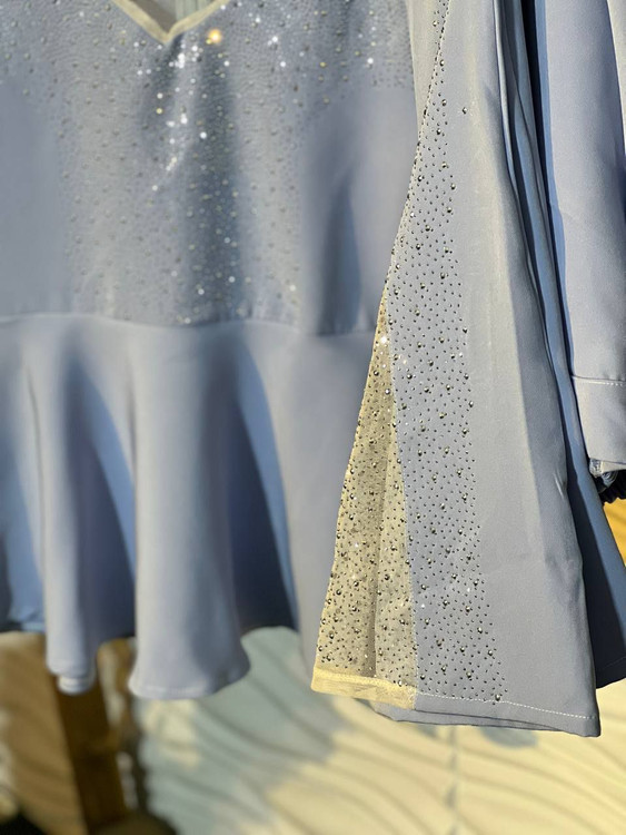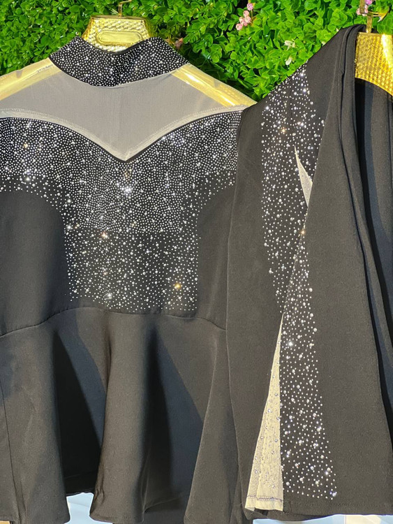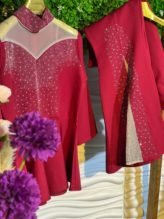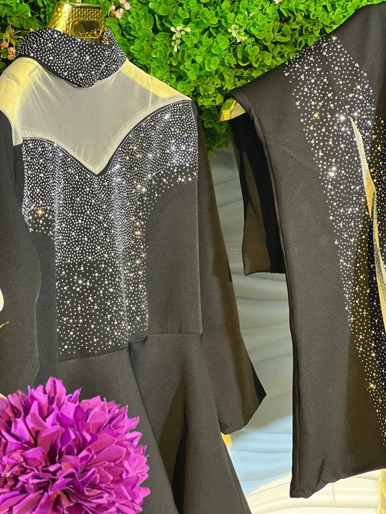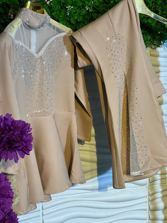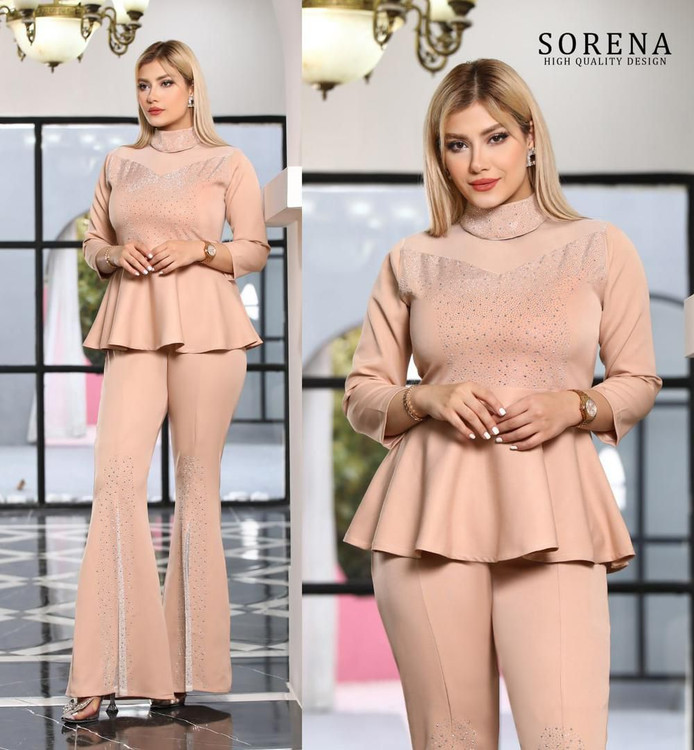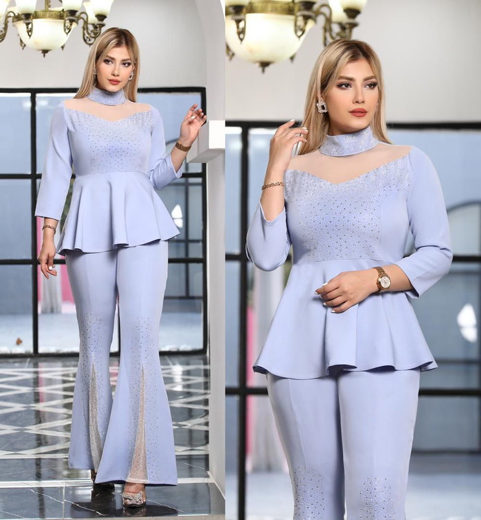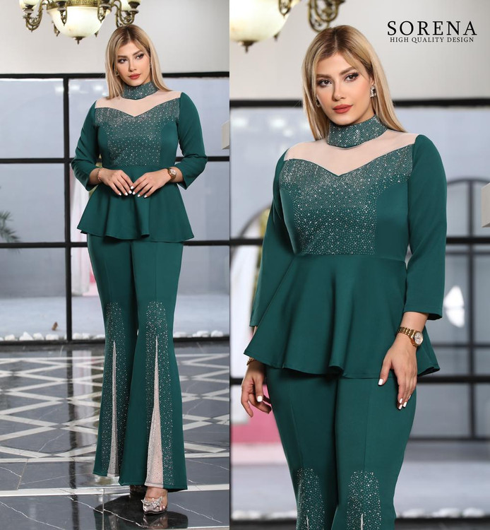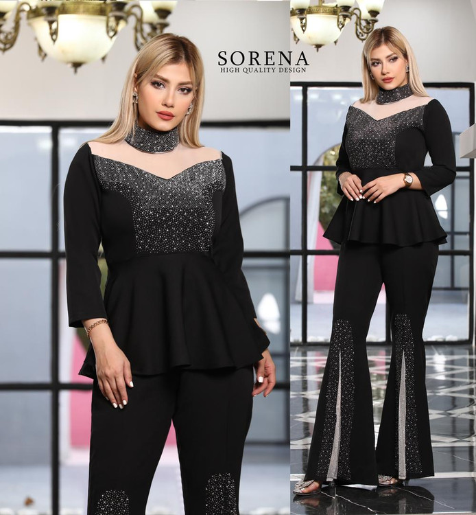 جنس : کرپ مازراتی درجه یک به همراه فول نگین حرارتی کار شده،پشت شومیز زیپ میخوره،پشت شلوار کش داره و به همراه دکمه و زیپ